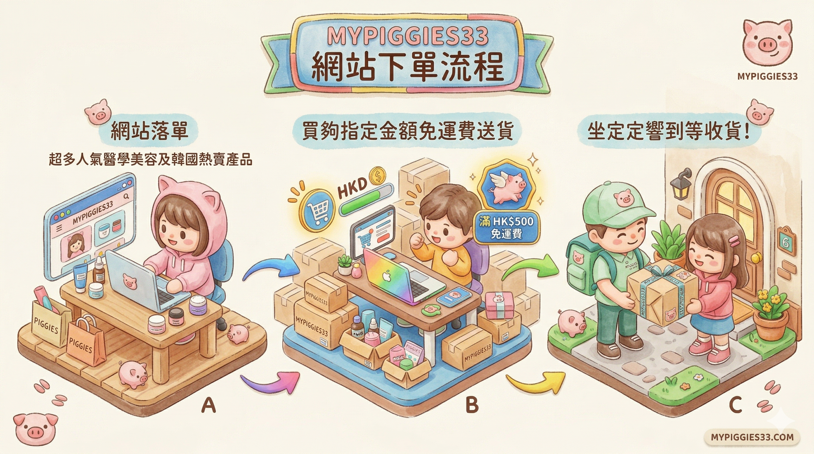 MYPIGGIES33網店購物折扣後金額滿$499即可免運費於本地送貨,未滿指定金額即運費到付。